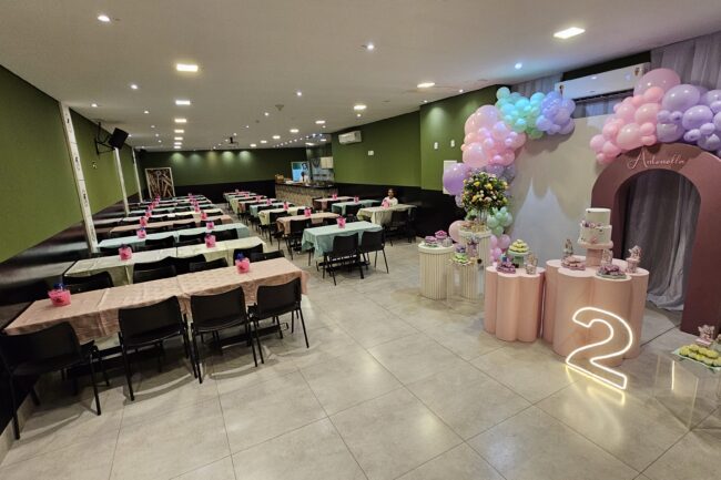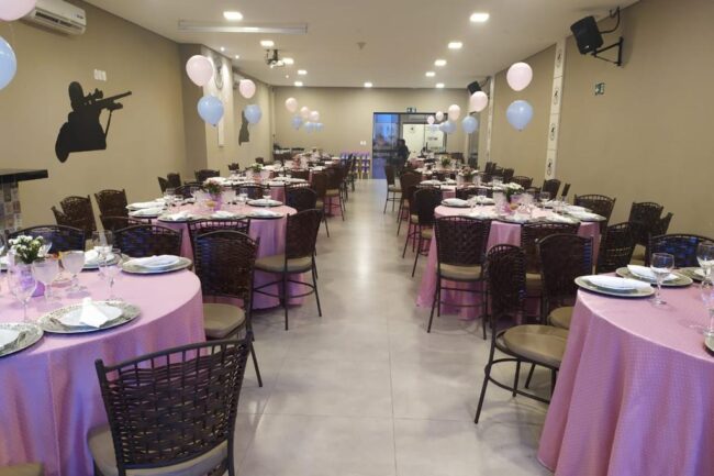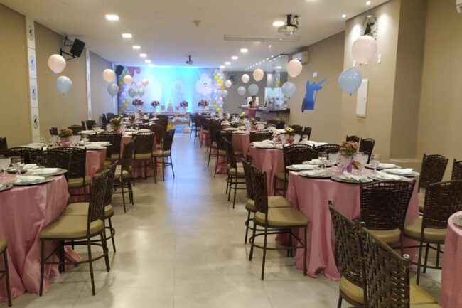 Ao locar, você conta à sua disposição com mesas, cadeiras, cozinha montada , geladeira , espaço kids, fraldário e cadeira de amamentação, serviço de recepção, segurança e manutenção dos banheiros durante o evento.